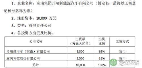 9月1日露笑科技发布公告表示,露笑科技股份有限公司(以下简称“露笑科技”)于2017年8月31日召开的第三届董事会第三十七次会议审议通过了《关于对外投资设立合资公司的议案》,同意露笑科技拟使用自有资金出资3500万元与奇瑞商用车(安徽)有限公司(以下简称“奇瑞”)共同设立奇瑞集团新能源汽车有限公司(以下简称“合资公司”,暂定名,最终以工商登记核准名称为准)。