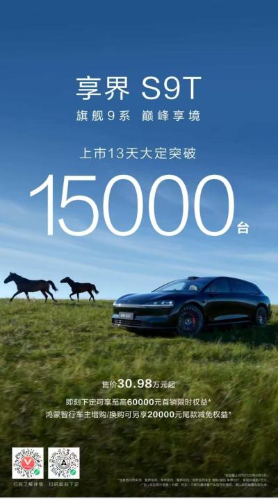 9月30日,从鸿蒙智行官方处获悉,其首款旅行车享界S9T上市13天,大定突破15000台。
