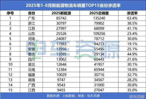 从2025年1-8月新能源物流车累计销量TOP15省份的渗透率表现来看,新能源物流车市场“存量转化”加速演进。新能源物流车销量TOP15省份7成以上渗透率突破25%,其中广东、浙江、江苏、山东也是我国GDP前四省份和物流车销量头部省份,渗透率也保持领先状态,说明在当地新能源物流车“存量转化”如火如荼。
