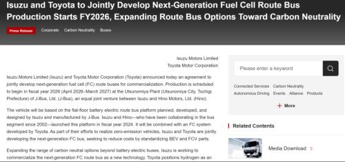 日前,五十铃汽车与丰田汽车宣布合作计划,双方将联合研发一款氢燃料电池公共汽车,并由合资公司负责生产。