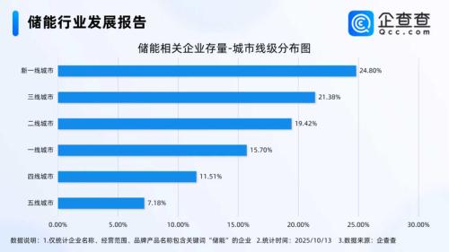 从城市线级分布来看,分布在新一线城市的储能相关企业最多,占比24.80%。其次,分布在三线城市、二线城市的相关企业分别占比21.38%、19.42%。