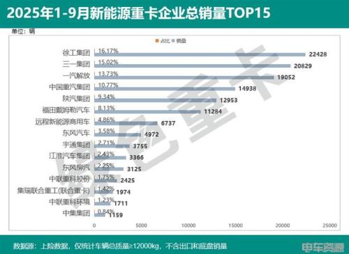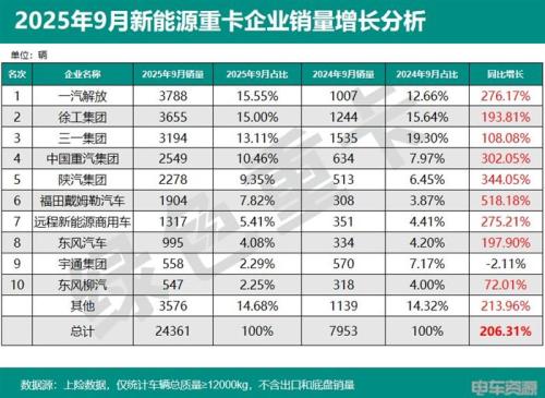 9月份新能源重卡销24361同增206.31%解放/徐工/三一居前三