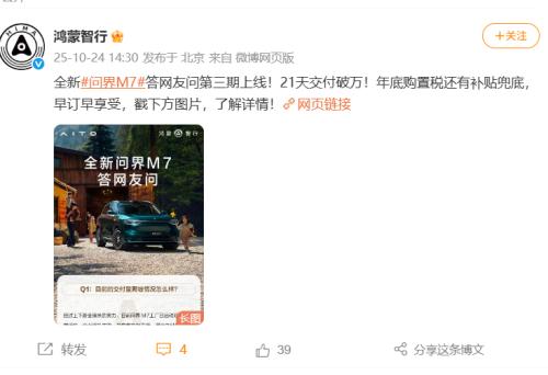 10月24日,鸿蒙智行发布全新问界M7答网友问第三期,对于产能以及购置税补贴政策进行了介绍。