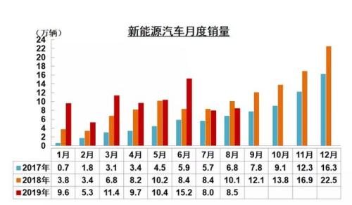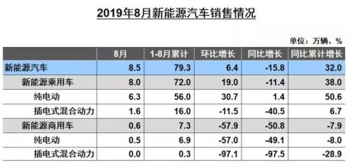新能源汽车方面,今年8月,新能源汽车产销分别完成8.7万辆和8.5万辆,比上年同期分别下降12.1%和15.8%。