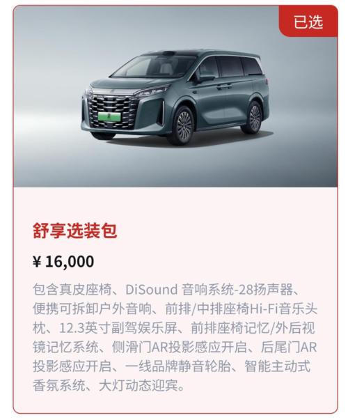 值得一提的是,在这个顶配车型上,还提供了一个1.6万元的“舒享选装包”。
