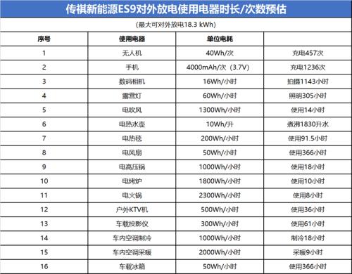 一车多用途是传祺新能源ES9的一大亮点,支持快充、慢充、对外放电以及车内供电功能,其搭载25.57kWh电池包,最大可对外放电18.3 kWh,可满足多款电器产品的户外用电。根据统计,一台传祺新能源ES9释放的电量可以为手机充电1000+次,支持电火锅工作8个多小时,平时带上一家人露营郊游,传祺新能源ES9的外放电量足够一家人在户外进行一次完美的露营之旅。