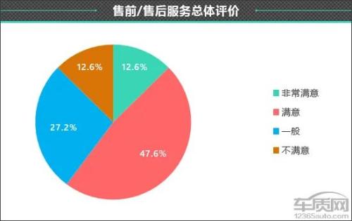 不过,在售前/售后服务总体评价中,接受调查的车主还是给出了相对客观的评价,其中认为“非常满意”的车主占比为12.6%,认为“满意”的车主占比为47.6%,认为“一般”的车主占比为27.2%,认为“不满意”的车主占比为12.6%。