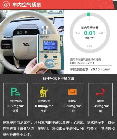 在车内空气质量测试环节,将车辆放置在车辆较少的内部地面停车场中,实测2025款理想i6的车内甲醛含量为0.01mg/m³,符合2012年3月1日起实施的,由原环保部和国家质量监督检验检疫总局联合发布的《乘用车内空气质量评价指南》(中华人民共和国国家标准GB/T 27630-2011)中的相关标准。