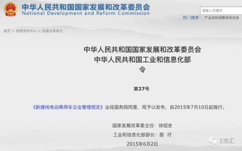 2015年,发改委颁布了“新建纯电动乘用车企业管理规定”,业界称其为“27号令”,自2016年3月启动新能源汽车生产资质审批以来,获得资质的16家企业,都是按照“27号令”的规定来办理申请的。
