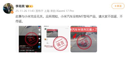 李肖爽表示:“此事与小米完全无关。众所周知,小米汽车没有M7型号产品,请大家不信谣、不传谣。”