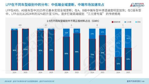 根据盖世汽车研究院数据,从动力类型来看,2025年1-9月,磷酸铁锂电池在BEV中渗透率达81%,在PHEV中达76%。从车型级别来看,从A00/A0级全域垄断,到A、B级中端加速攻占,再到C级高端占比从32%跃升至53%;价格带上,在15万以下绝对主导,15-25万占比85%-88%,25万以上也从26%升至35%。