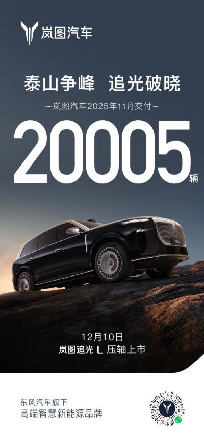 岚图汽车11月交付新车20,005辆,同比增长84%,实现连续10个月环比增长。11月10日,该品牌第30万辆整车正式下线。新产品岚图泰山已上市,追光L计划于12月上市,渠道网络也在持续扩张。