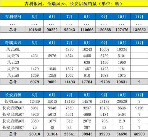 销量数据是这场角力最直观的注脚:今年11月,吉利银河月度销量已攀升至13.27万辆的巅峰,展现出强大的市场统治力。奇瑞风云的月销量亦稳定在约2万辆水平,稳扎稳打。
