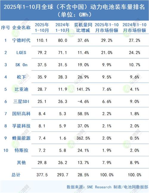 近日,韩国研究机构SNE Research披露2025年1-10月全球(不含中国)的电动车(EV、PHEV、HEV)动力电池装车量数据,达377.5GWh,同比增长28.5%。