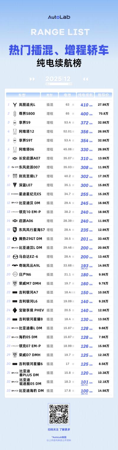 热门插混、增程轿车纯电续航榜