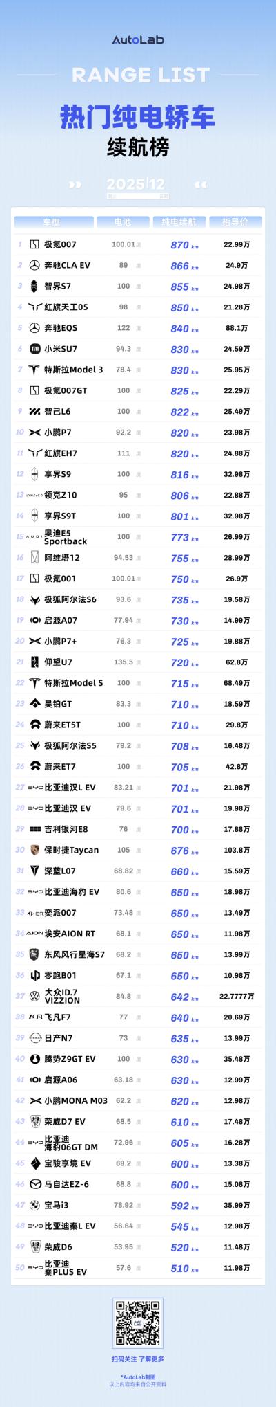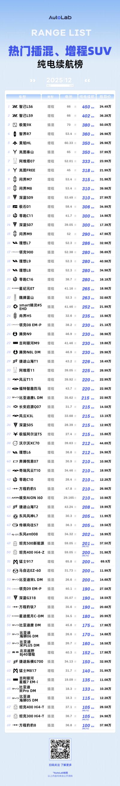 首先还是声明,这个跟我们《LAB测试》的51车续航实测榜单不同。