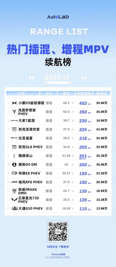 年末,小鹏首款增程MPV X9登场,上来就塞了块63.3度的大电池,纯电续航干到450公里,成为了插混、增程MPV续航榜的榜首。