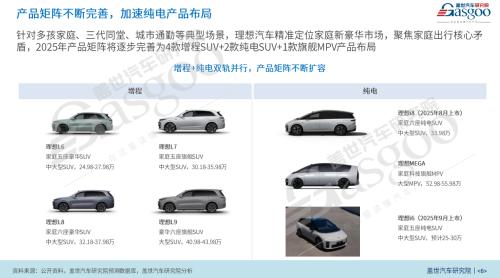 理想汽车通过清晰的产品战略持续深化家庭豪华市场布局。2025年,其产品矩阵形成“4款增程SUV + 2款纯电SUV + 1款旗舰MPV”体系,覆盖多孩家庭、三代同堂及城市通勤三大核心场景。