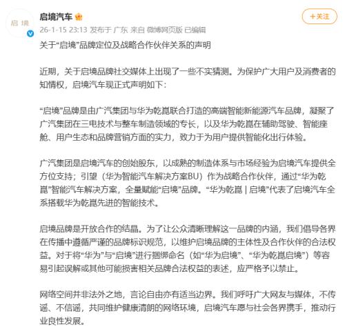 声明指出,“启境”品牌是由广汽集团与华为乾崑联合打造的高端智能新能源汽车品牌,凝聚了广汽集团在三电技术与整车制造领域的专长,以及华为乾崑在辅助驾驶、智能座舱、用户生态和品牌营销方面的实力,致力于为用户提供智能化出行体验。
