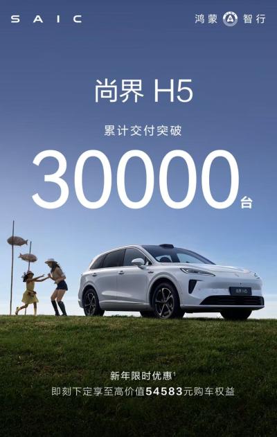 1月26日,鸿蒙智行官方宣布,旗下的尚界H5车型累计交付已突破3万辆。
