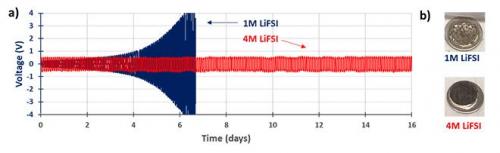 在1M LiFSI in DME下,以0.5 mA/cm²的电流密度进行枝晶测试,经过连续几天的锂剥离和电镀后,观察到枝晶生长,如同通过增强电芯极化所揭示的(图3a)。另一方面,在高浓度电解质(4M LiFSI in DME)中,由于锂金属上形成了更稳定和紧凑的富锂固态电解质膜(SEI),枝晶生长受到抑制(图3b)。