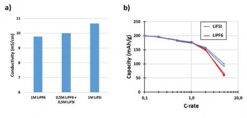 此外,使用LiFSI大量代替LiPF6,可以获得更好的性能。用LiFSI代替LiPF6,可以实现更高的离子电导率(图1a)和更高的电解质迁移数。因此,比起基于LiPF6的电解质,在NMC811/石墨电芯中,基于LiFSI的电解质,具有更高的倍率性能(图1b)。