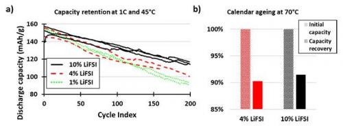 增加LiFSI/LiPF6的比率,可提高45°C下的寿命以及存储老化(Calendar Aging,随时间发生的容量损耗),这是因为LiFSI具有更高的热稳定性和化学稳定性,比LiPF6产生的HF更少。