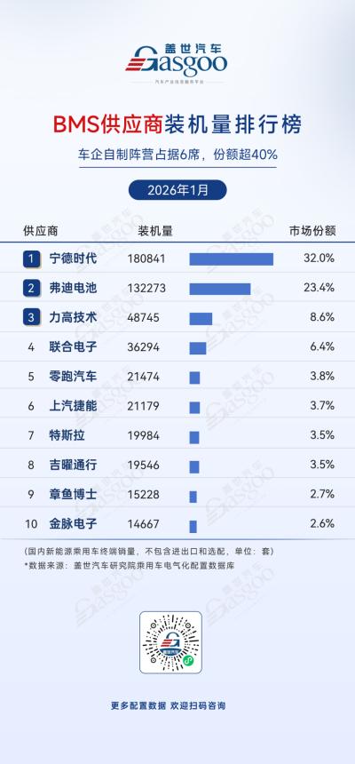 根据盖世汽车研究院数据,2026年1月中国新能源汽车电气化核心环节已进入头部优势固化与梯队竞争加剧并行的阶段。围绕动力电池、电池PACK、BMS、驱动电机、电机控制器及多合一主驱系统(纯电)等关键环节,装机数据呈现鲜明的市场特征,行业资源加速向具备全产业链布局、技术创新能力及规模化配套优势的企业集中,车企垂直整合与第三方专业供应体系的发展路径差异进一步凸显。相关装机量数据为观察中国新能源汽车核心零部件产业的竞争格局、发展趋势及产业自主化进程提供了重要依据。