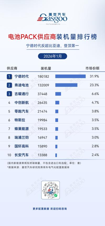 弗迪电池,2026年1月装机量132009套,市场份额23.3%。