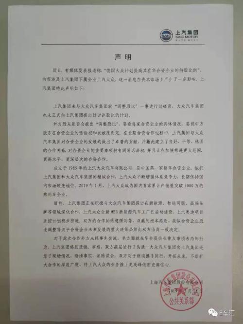 然而在事隔不久的3月18日,上汽集团发表声明称:上汽集团未与大众汽车集团就“调整股比”一事进行过磋商,大众集团也未正式向上汽集团提出过讨论股比的计划。