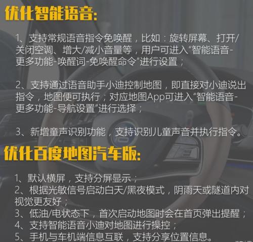 在优化功能方面,此次主要针对智能语言、百度地图汽车版以及屏保进行了提升。其中,对部分常规的语音指令无需进行唤醒,并支持语音直接控制地图,同时还能够识别童声;百度地图汽车版可以支持横屏和分屏的显示,在低油/低电状态下,还首次启动还会弹出提醒;屏保也进行了优化,在按下Pad桌面的息屏键后,即可进入屏保状态,同时背景为黑色,只显示时钟、空调和多媒体信息。