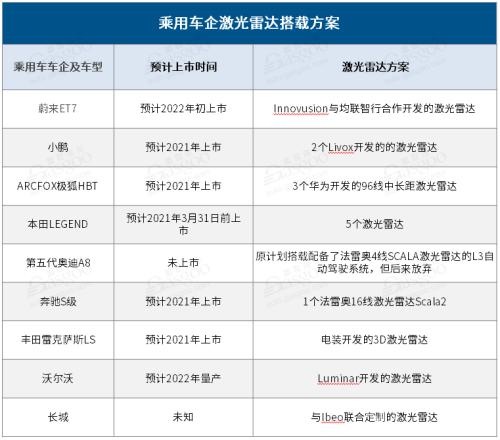 乘用车企激光雷达搭载方案,盖世汽车整理