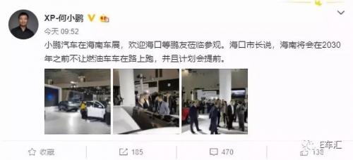 在2019(首届)海口国际新能源汽车展览会期间,UC创始人、小鹏汽车董事长表示:“海口市长说,海南将会在2030年之前不让燃油车在路上跑,并且计划会提前。”