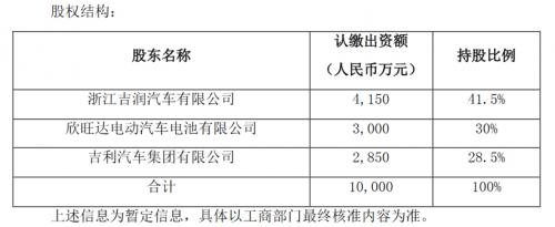 据公告披露,山东吉利欣旺达注册资本为人民币10,000万元,由吉润汽车、欣旺达及吉利汽车集团以货币形式出资,三方拟认缴出资金额分别为4150万元、3000万元、2850万元,持股比例分别为41.50%、30%、28.50%。