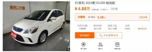 如果你说特斯拉车主不在意这些,那么再来看看“老百姓专属”的,也是北京地区保有量相当大的EV200车型。这辆16年3月上牌的EV200轻快版,补贴后的均价在11.6万元左右,加上保险应该在12万元之上。在两年、3万公里之后,就只剩下了4.88万元的残值,且商家车源的报价一般偏高,实际成交价一般会更低。对于我们辛苦的血汗钱,这样的折旧率显然难以接受。不过,这并非我们和新能源有仇,而是事出有因。