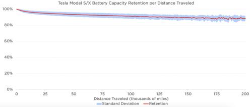 多年来,特斯拉偶尔会发布一些关于其电池退化的数据。今年,该公司更新了其Model S和Model X车型的电池损耗数据,称在行驶20万英里后,这两款车的电池容量仍能保持约90%。