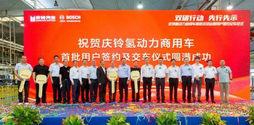 博世氢动力系统(重庆)有限公司和庆铃汽车股份有限公司今日在重庆宣布,首批搭载博世氢动力系统的商用车正式交付,并投入使用。来自重庆市经信委、庆铃汽车(集团)有限公司和博世动力总成事业部的领导以及民生物流等客户代表共同出席了此次交付仪式。