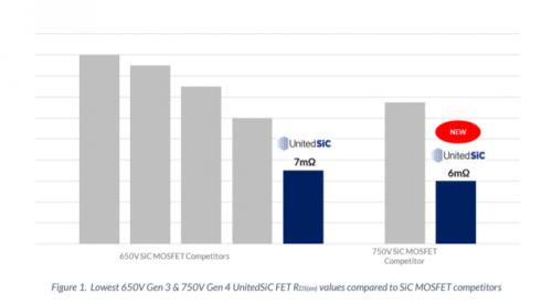 这些优势通过品质因数(FoMs)进行量化,例如导通电阻RDS(on) x A,这是衡量单位晶粒面积的传导损耗的指标。第四代SiC FET在高和低晶粒温度下,都达到了据称是市场上的最低值。FoM RDS(on) x EOSS/QOSS在硬开关应用中很重要,据估计是最接近的竞争产品的一半。FoM RDS(on) x COSS(tr)在软开关应用中很重要,UnitedSiC声称,其器件成本比额定电压为650V的竞争器件低约30%,而UnitedSiC器件的额定电压为750V。