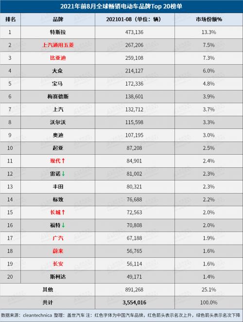 8月全球最畅销Top 20电动车品牌榜:比亚迪蝉联销冠,小鹏闯进榜单