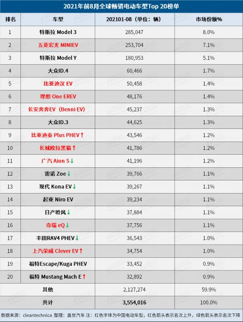 8月全球最畅销Top 20电动车榜单:中国车型占据12个席位,Model Y销量再超Model 3