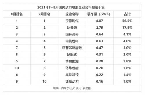 事实上,从刚刚发布的9月份国内动力电池企业装车量来看,一跃占据56.5%市场份额的宁德时代,用比8月份高出近5个百分点的增长,强势捍卫了自己的“王者地位”。