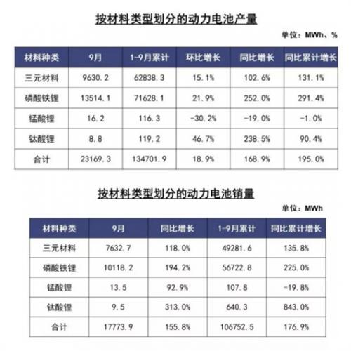 销量方面,2021年9月,三元电池销售7.6GWh,同比增长118.0%,占总销量42.9%;磷酸铁锂电池销售10.1GWh,同比增长194.2%,占总销量56.9%。