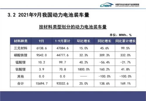从数据的角度出发,装车量方面,2021年9月,国内动力电池总装车量为15.7GWh,同比上升138.6%,环比上升25.0%。其中三元电池共计装车6.1GWh,同比上升45.6%,环比上升15.0%;磷酸铁锂电池共计装车9.5GWh,同比上升309.3%,环比上升32.3%。