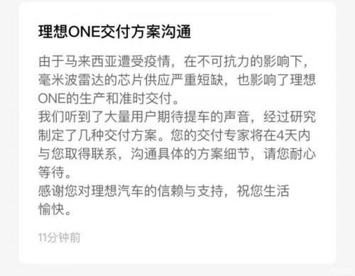 对于销量下滑,理想汽车联合创始人兼总裁沈亚楠通过微博回应称是由于“受到芯片供应持续短缺的影响”。目前,理想ONE标配的5颗博世第五代毫米波雷达无法如期交付,并推出了“先交付后补装雷达”的分期交付策略。