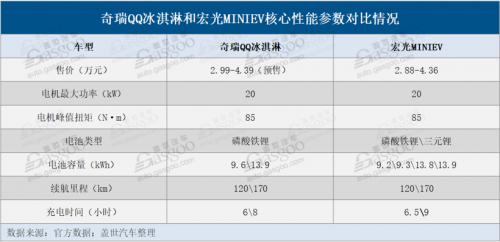 再看性能,奇瑞QQ冰淇淋和宏光MINIEV两款车的核心参数,几乎是一比一的复刻。两款车都搭载了永磁同步电机,最大功率20kW,峰值扭矩85N•m。电池方面,两款车都搭载了磷酸铁锂电池(宏光MINIEV还有搭载三元锂电池的版本),续航里程也都是120公里和170公里两个版本。充电时间(慢充)上两款车略有不同,奇瑞QQ冰淇淋是6小时和8小时,宏光MINIEV是6.5小时和9小时。