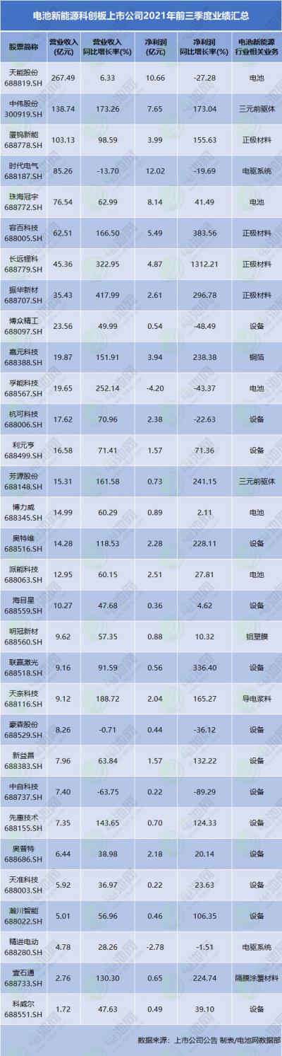电池新能源产业链公司立足科技创新,叠加高成长赛道,营业收入、净利润同比大幅上升。31家科创板电池新能源产业链公司中,23家在今年前三季度实现了营业收入与净利润同比双增长,占比超70%。同时,营业收入与净利润均同比增逾1倍的公司有10家,占比超30%。