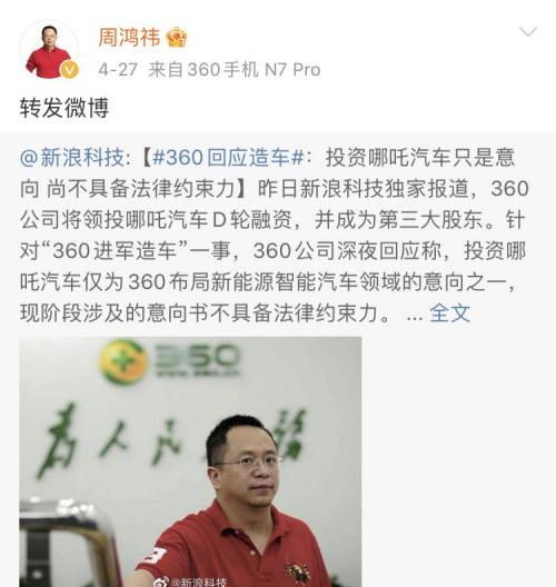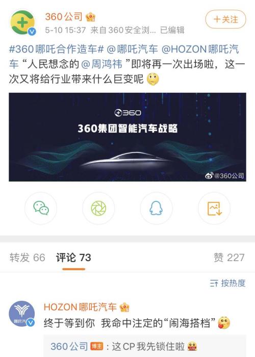 5月10日,360公司官方微博宣布,360将与哪吒汽车合作造车,360董事长周鸿祎即将再一次出场,同时配图写有“360集团智能汽车战略”的字眼。随后,哪吒汽车官方微博转发了此条消息,并配文“终于等到你,我命中注定的‘闹海搭档’”。