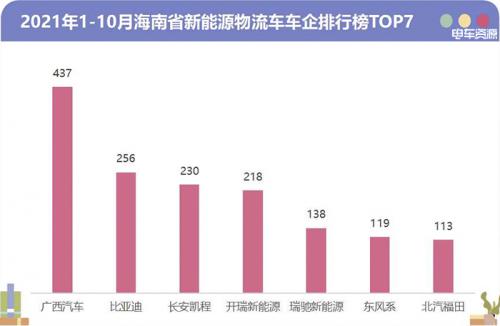 2021年1-10月,海南省新能源物流车企业销量排行榜中,广西汽车凭借437辆的销量成为榜首,占比21.06%,其热销车型有五菱电卡货柜、五菱EV50。