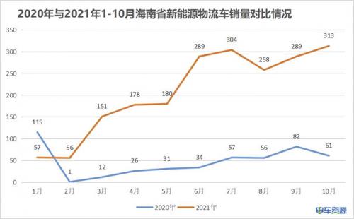 从2021年前10月的单月销量来看,海南新能源物流车销量大体呈上涨趋势,虽然1月、2月的销量不佳,但后续销量稳步增长,10月销量到达顶峰,为313辆。相信在政策、路权及各方面的推动下,未来发展潜力无限。