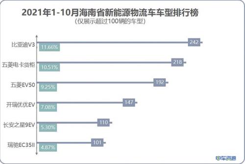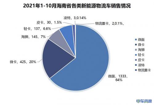 2021年1-10月,海南市场新能源物流车共销售2075辆,位居省市销量排行榜第13位,同比2020年1-10月,暴增337%。